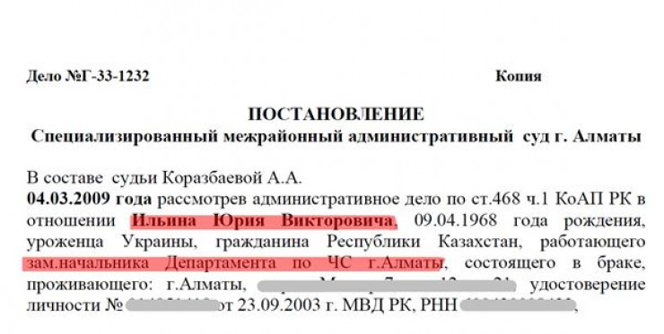2012 жылы Ильин тағы да істі болған. Сол кезде ол Алматы қалалық Жұмылдыру дайындығы, азаматтық қорғаныс, авариялар мен дүлей зілзалалардың алдын алуды және оларды жоюды ұйымдастыру басқармасының бастығы қызметінде болған. Алматы Әділет департаменті Юрий Ильин басқаратын ведомствоны тексеріп, бірнеше заңбұзушылық тапқан. Сол кезде Ильин заңсыз бұйрықтар шығарды деп айыпталып, оған 16 мың теңге көлемінде айыппұл салынған.
