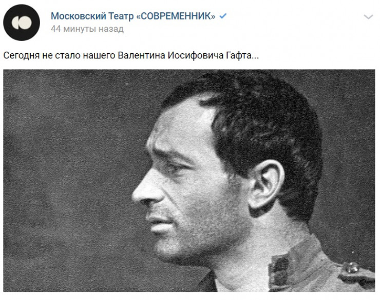 Информацию подтвердила его жена Ольга Остроумова. Также о смерти артиста сообщили в театре "Современник", где Гафт служил с 1969 года.