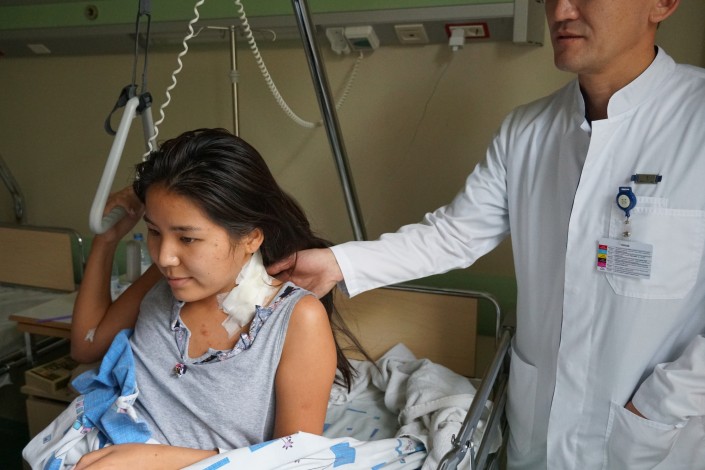 Первой пациенткой в стране, которой провели данную операцию, стала 22-летняя астанчанка Алина Бабанаева. У девушки была опухоль шейного отдела спинного мозга, которая проросла в спинномозговой канал и вышла из межпозвоночных отверстий наружу.