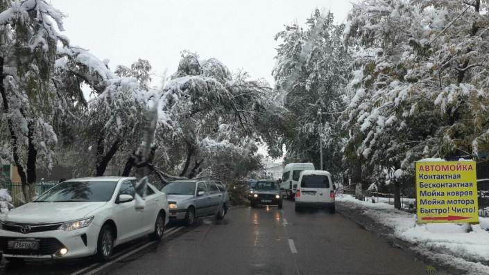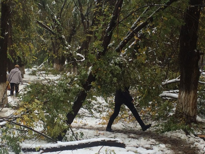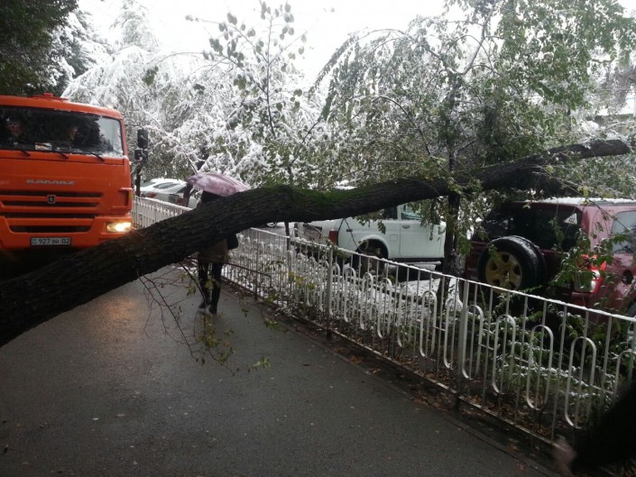 Тем временем, деревья падали также и в Алматы, где в ночь на 14 октября выпал первый снег. Как уточнили в городском ДЧС, всего было зафиксировано 4 таких случая - деревья и ветки падали на дорогу. Пострадавших нет.