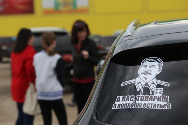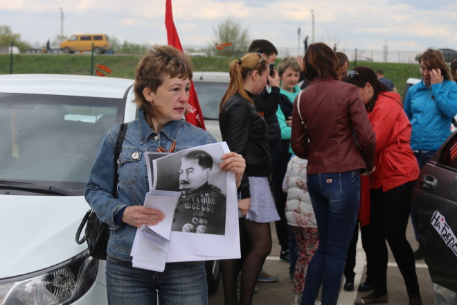 9 мая участники автопробега собрались на стоянке возле торгового центра "Дина". Все машины были разукрашены военной символикой и флагами СССР, на многих имелись надписи "Спасибо деду за победу", "На Берлин", "Помним и гордимся!", "За Сталина!", "Спасибо бабуле за меткие пули" и прочие. Водители были одеты в гимнастерки, пилотки военного времени.