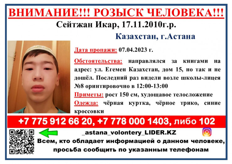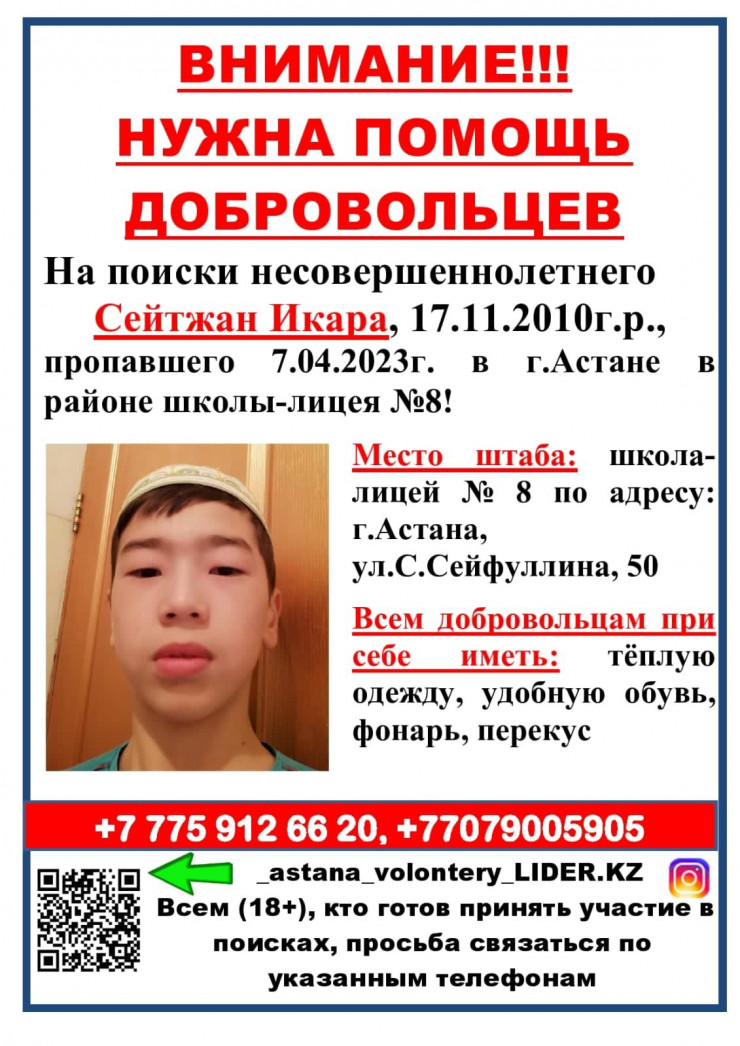 Ушел за книгами и не вернулся: 12-летний мальчик пропал в Астане Фото предоставлено волонтерами