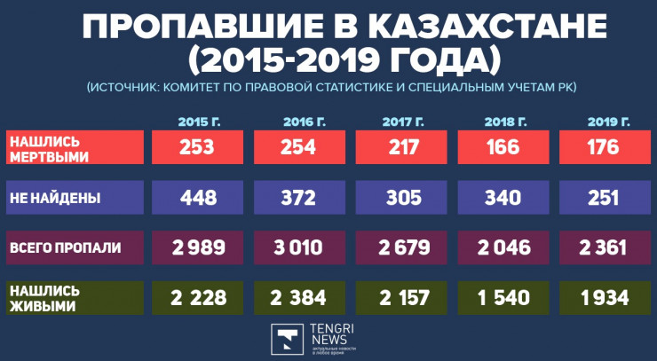 В Комитете по правовой статистике и специальным учетам Генпрокуратуры Казахстана предоставили информацию о пропавших за последние пять лет в Казахстане людях. Всего с 2015 по 2019 годы объявили о розыске 13 085 человек, из них 1066 обнаружены мертвыми, а 1716 человек до сих пор не найдены, передает корреспондент Tengrinews.kz.