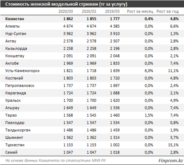 Дороже всех услуга обходится жительницам Алматы - 4 700 тенге и Нур-Султана - 4 000 тенге. Дешевле всего женская стрижка в Семее - 1 000 тенге.