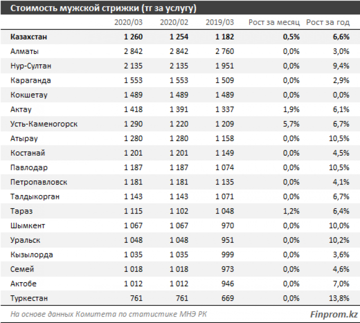 Дороже всего мужская стрижка оказалась в Алматы - 2 800 тенге и Нур-Султане - 2 100 тенге. Дешевле всего услуга обходится мужчинам Туркестана - около 750 тенге.