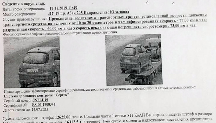 В квитанции сообщается, что 12 ноября автомобиль женщины превысил разрешенную скорость на 17 километров в час. При этом на снимке видно, что автомобиль стоит на эвакуаторе. Штраф составил 12 625 тенге.
