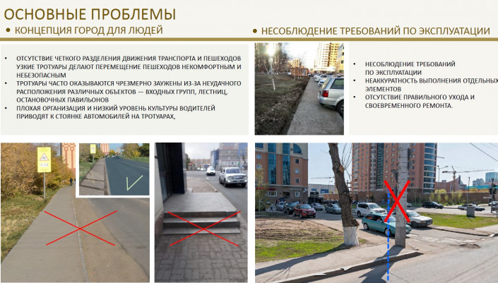 Специалисты отмечают отсутствие в городе четкого разделения движения транспорта и пешеходов. Узкие тротуары делают перемещение пешеходов некомфортным и небезопасным. Есть участки, где люди вынуждены ходить по проезжей части.