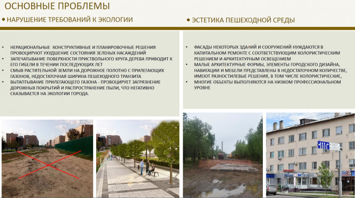 По данным управления, нерациональные конструктивные и планировочные решения провоцируют ухудшение состояния зеленых насаждений при последующей эксплуатации. Фасады отдельных зданий и сооружений нуждаются в капитальном ремонте с соответствующим колористическим решением и освещением.
