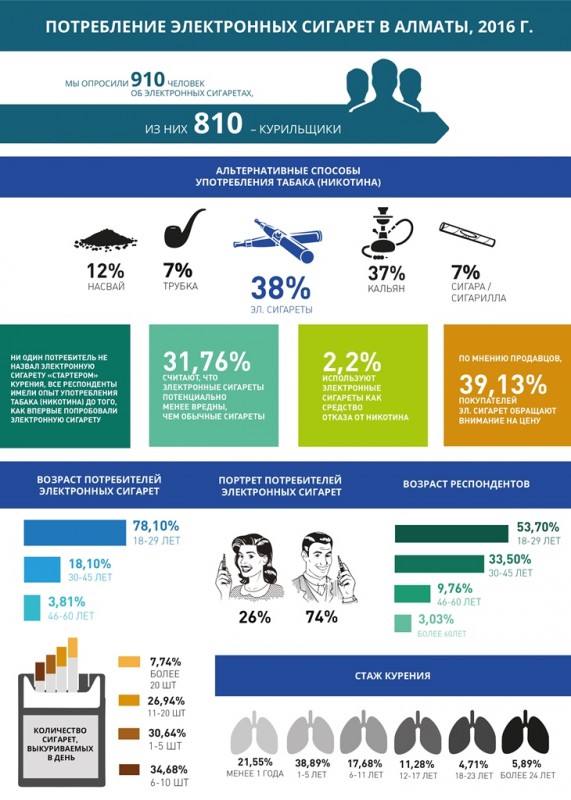 Между тем общественный фонд совместно с ALMA University провели социологическое исследование среди курильщиков и продавцов табачной продукции. Опрос осуществлялся в марте-апреле 2016 года. В ходе исследования было опрошено более тысячи человек. Анализ проводился по 910 анкетам совершеннолетних курильщиков и продавцов электронных сигарет.