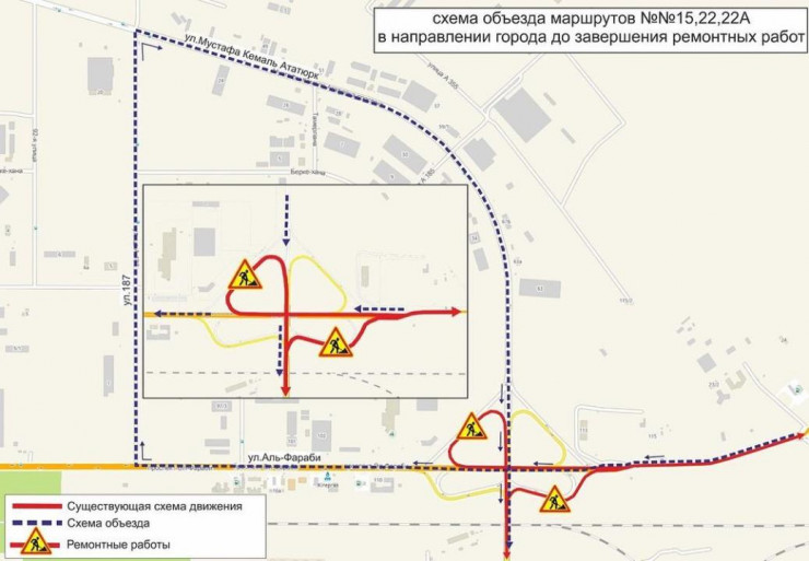 Сообщается, что будут перекрыты правосторонние съезды в направлении жилого массива Железнодорожный, а также подъем со стороны проспекта Аль-Фараби в направлении улицы Кошкарбаева.