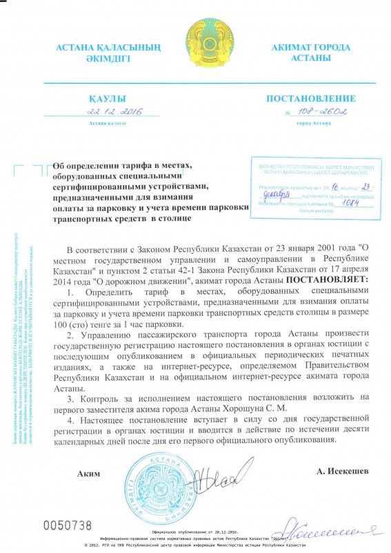 Постановление акима Астаны "Об определении тарифа в местах, оборудованных специальными сертифицированными устройствами, предназначенными для взимания платы за парковку и учета времени парковки транспортных средств в столице" официально опубликовано сегодня, 28 декабря.
