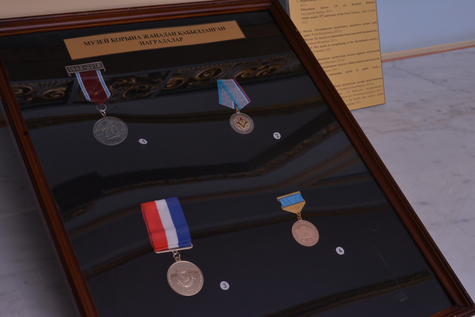 Так, к примеру, эти медали выставлены впервые, так как появились в фонде в 2015 году. На фото - юбилейная медаль к 70-летию Победы, Израиль (№ 1); медаль "За заслуги в укреплении международной безопасности", Россия (№ 2); медаль "За выдающиеся заслуги в общественной деятельности", Израиль (№ 3); медаль "Нравственность" от Казахского женского педагогического института, Казахстан (№ 4).