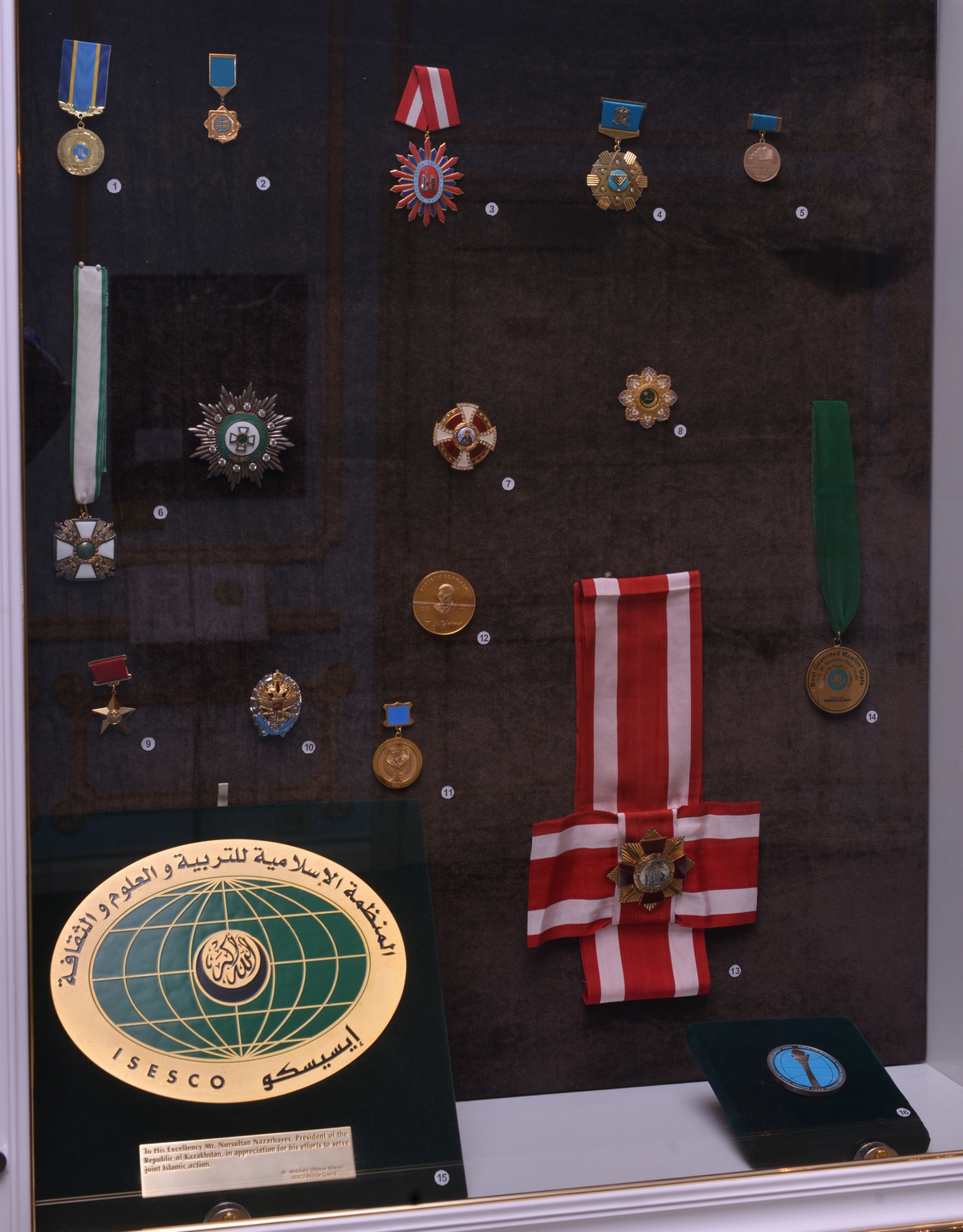Экспозиция состоит из тематических разделов, в которых представлены награды в сфере межгосударственного сотрудничества и интеграции; госуправления и экономики; безопасности; межнационального и межконфессионального согласия; в сфере образования, науки и здравоохранения; в сфере культуры; спорта и туризма. Здесь, к примеру, представлены медали Назарбаева, как почетного профессора Российского института стали и сплавов (№ 2), почетного доктора Монгольского государственного университета (№ 3), почетный доктор Киевского национального университета имени Тараса Шевченко (№ 4), медаль почетного доктора МГУ имени Ломоносова (№ 6) и другие.