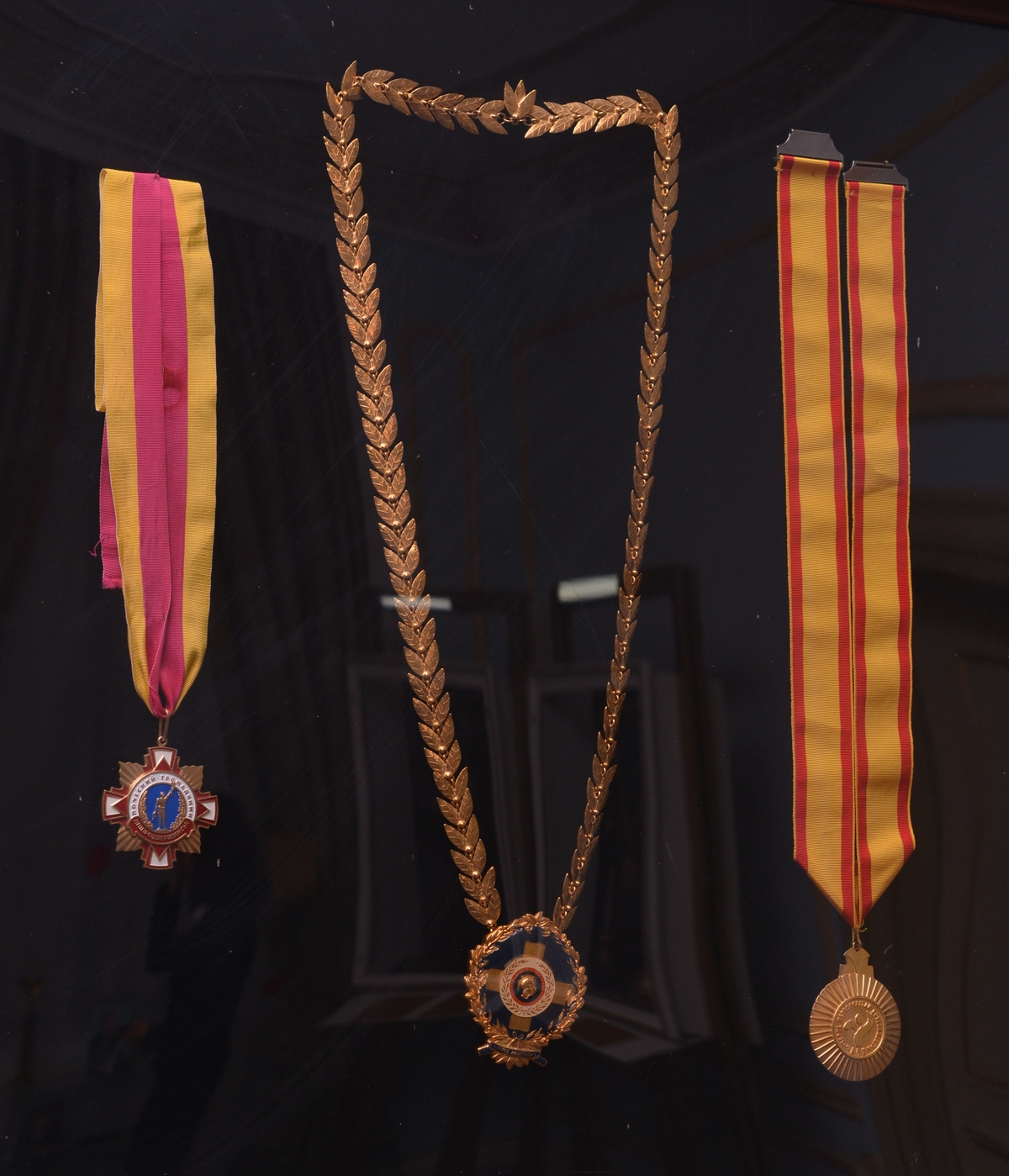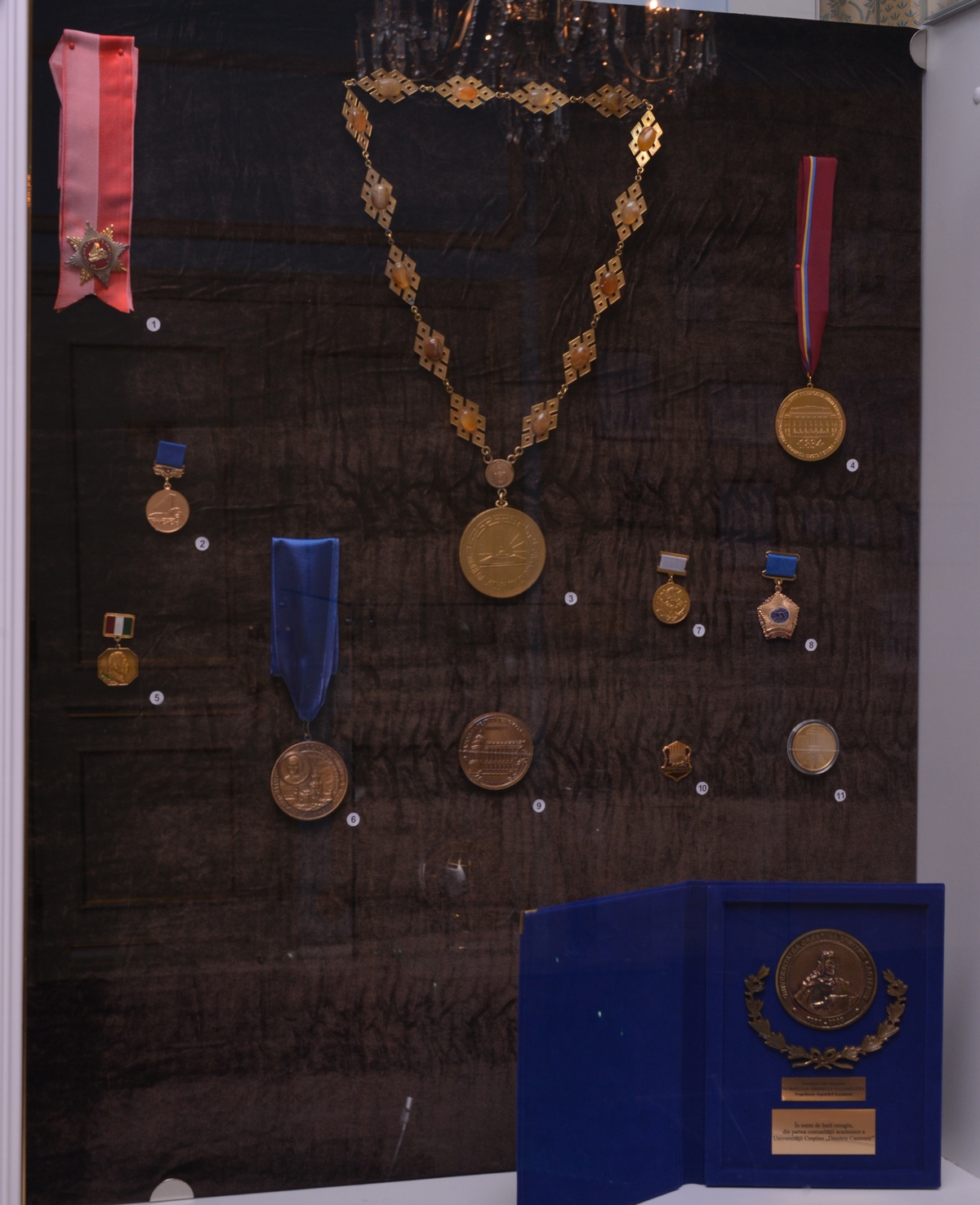 В фонде музея более пятисот наград Президента, на выставке представлены - более двухсот, разнообразных по составу - среди них: ордена, медали, почетные и памятные нагрудные знаки, аттестаты, свидетельства, удостоверения, дипломы, грамоты и сертификаты.