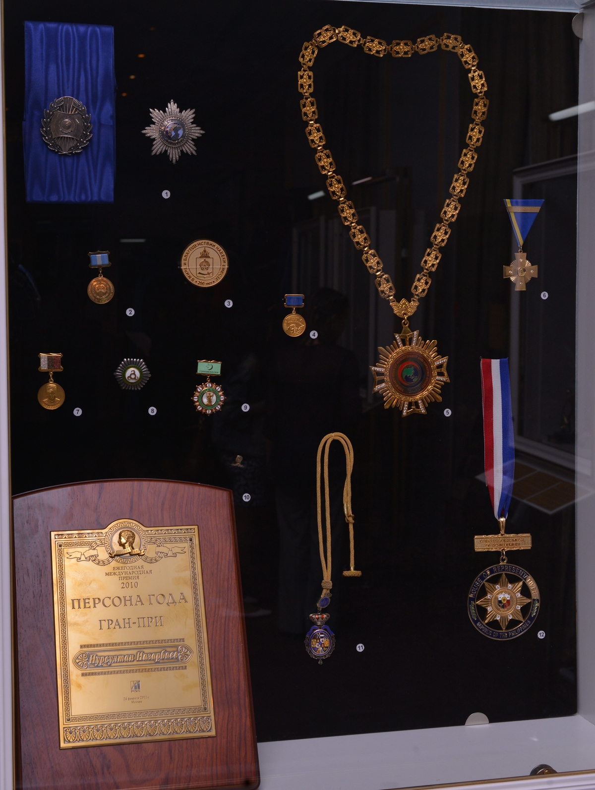 На выставке - награды разных государств и международных организаций. К примеру, в 2012 году Назарбаев был удостоен гран-при в номинации "Персона года" в России (№ 10). К слову, среди представленных наград под номером 5 - орден "За выдающиеся достижения и служение человечеству" Королевства Камбоджа (2010 год), под номером 6 - Крест Почета "За возрождение Украины" I степени (2003 год).
