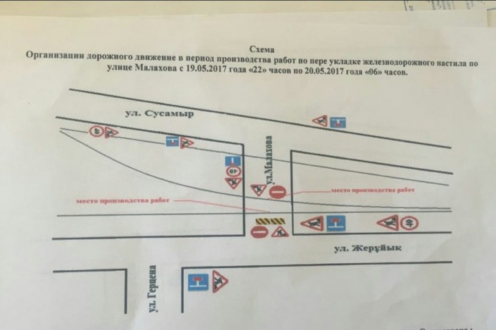 В связи с заменой настила железнодорожного переезда (№ 805) по улице Малахова движение транспортных средств с 22.00 19 мая до 06.00 20 мая будет ограничено от улицы Жеруйык до улицы Сусамыр.