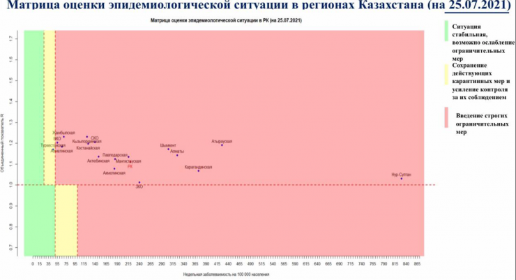 Согласно матрице оценки эпидемиологической ситуации в регионах Казахстана на 25 июля 2021 года, в "желтой" зоне находится только одна область - Алматинская, передает корреспондент Tengrinews.kz.