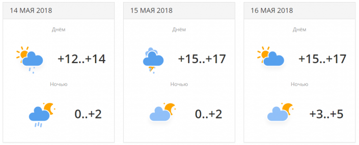Ночные осадки, и дневная гроза 15 мая. Температуры будут находится в районе +12...+17 градусов днем и около 0...+5 градусов ночью.