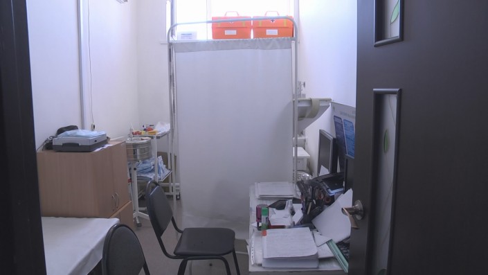 Очередь собирается в тесном коридорчике без сидений и без освещения. В распоряжении врачей всего семь кабинетов, поэтому в каждом принимают по два-три терапевта. Собственный кабинет только у гинеколога. Процедурный и доврачебный кабинеты есть, но регистратура и телефон отсутствуют.