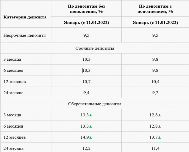 С 11 января 2022 года максимальные ставки вознаграждения по сберегательным депозитам со стандартными сроками на 3 и 6 месяцев повышены на 2 процента, а по сберегательным депозитам со стандартными сроками 12 месяцев – на 1 процент", - говорится в сообщении.