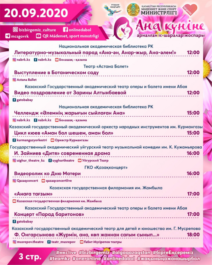 В Министерстве культуры и спорта отметили, что в честь празднования Дня матери запустят флешмоб "Анаға арнау", который будет направлен на сохранение и пропаганду ценности семьи, брака и традиции своего народа.