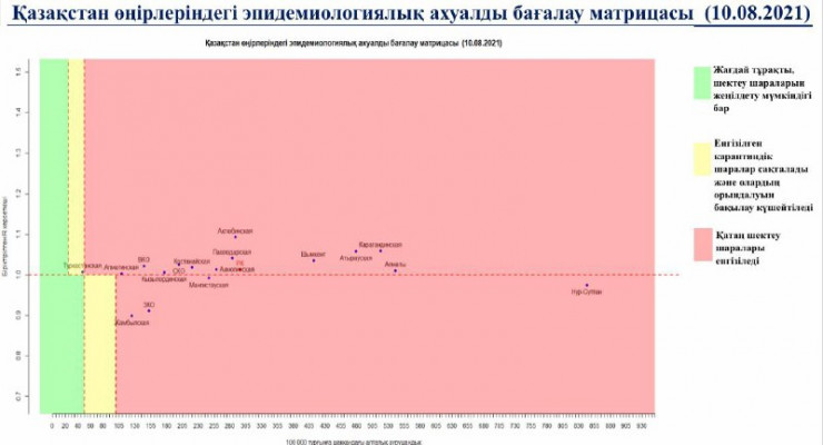 Опубликована матрица оценки эпидемиологической ситуации в регионах Казахстана на 10 августа 2021 года, передает Tengrinews.kz со ссылкой на МВК по нераспространению COVID-19.