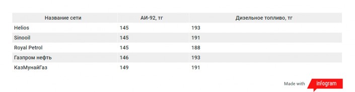 А вот стоимость дизеля осталась прежней абсолютно у всех. Дешевле всего солярка на АЗС Royal Petrol. Там заправиться можно по 188 тенге. Наиболее высокие цены у Helios и "Газпрома", которые просят по 193 тенге за литр.