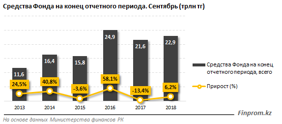 Средства Нацфонда на конец сентября 2018 года составили 22,9 триллиона тенге, что на 6,2 процента больше, чем годом ранее - 21,6 триллиона тенге. Максимальный объем средств, находящихся на счетах Нацфонда, наблюдался в соответствующем периоде в 2016 году - 24,9 триллиона тенге.