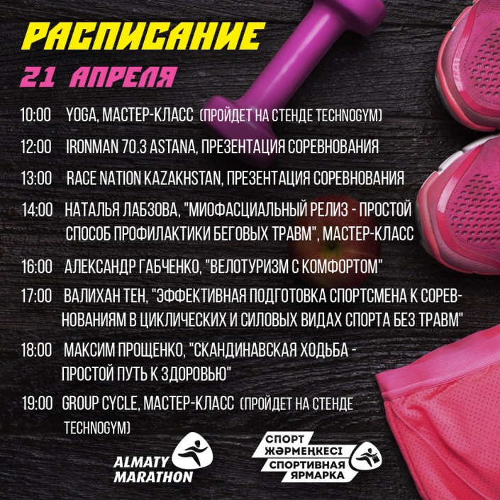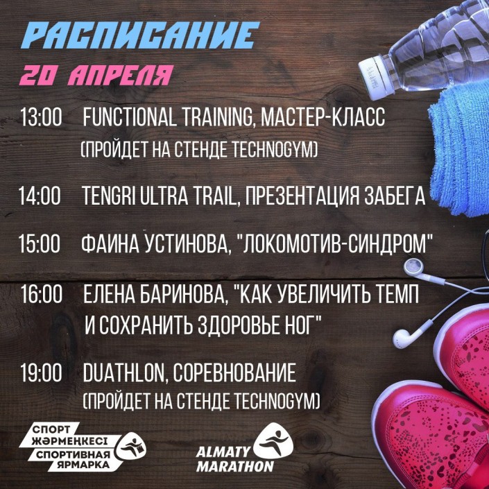Время работы ярмарки - с 10.00 до 21.00. Вход бесплатный. С наполнением спортивной ярмарки можно ознакомиться на сайте "Алматы Марафона" и его странице в Facebook.