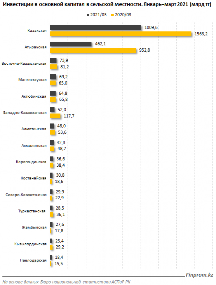 В региональном разрезе наибольший объем капитальных инвестиций пришелся на сельскую местность Атырауской области: 45,8 процента от всей страны, или 462,1 миллиарда тенге, на 51,5 процента меньше, чем годом ранее. В тройку лидирующих регионов также вошли Восточно-Казахстанская и Мангистауская области.