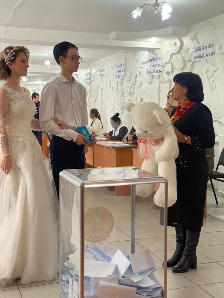 Молодожены Алтынбек Карибай и Гульбаршин Алимханова из Караганды пришли на избирательный участок сразу после регистрации брака. Невеста - в свадебном платье, жених - в костюме. Пару угостили шоколадом.
