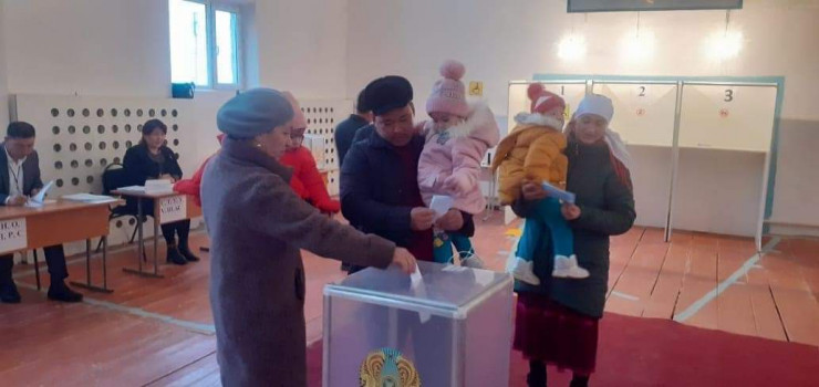 В Кызылординской области проголосовали родители тройняшек и двойняшек. Семья Алтынбаевых пришла на избирательный участок вместе с двухлетними дочками - тройняшками Айганым, Айганат и Асылым. Семья воспитывает 8 детей.