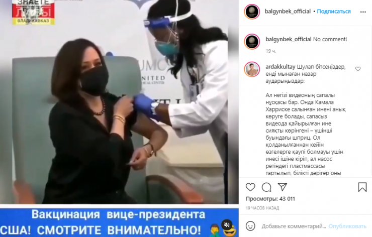 Камала Харрис 29 желтоқсанда вакцина салдырғаннан кейін, бұл видео Қазақстанда ғана емес, шетелде де қызу талқыға түскен. Видео сапасы нашар болған соң, шприц инесі көрінбейді, сондай-ақ қалпақшасы алынбағандай көрінеді.