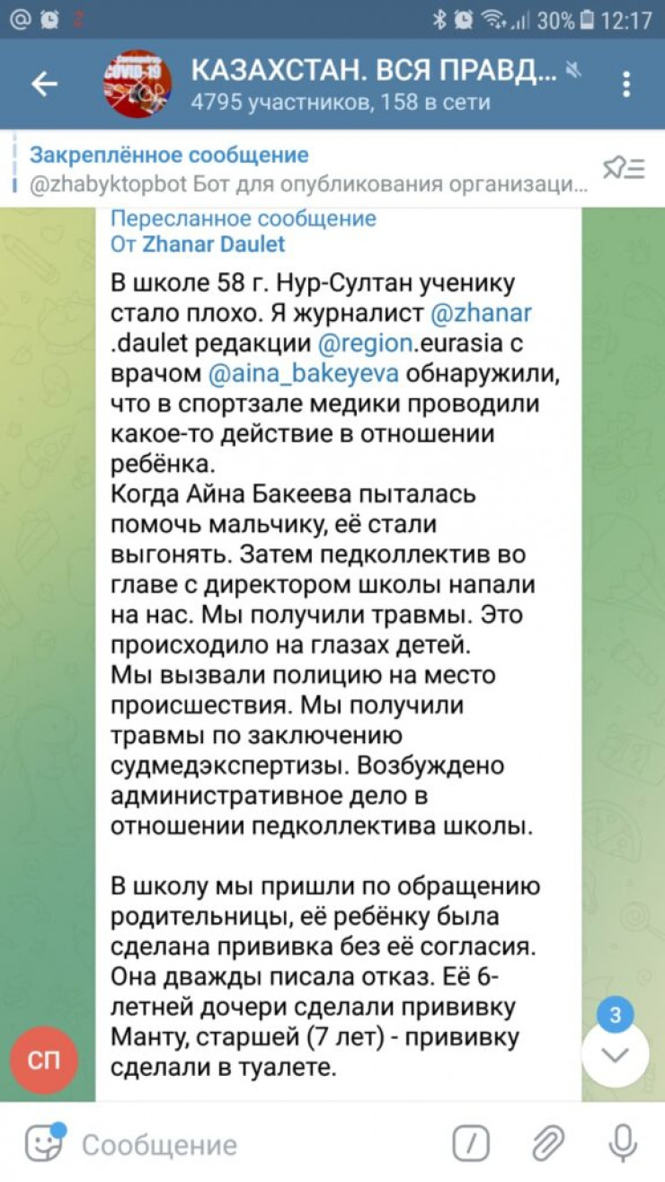 Ранее в сети появилось видео, на котором видно, как несколько женщин заходят в спортзал одной из школ. Автор видео утверждает, что она журналист, а рядом с ней находится врач Айна Бакеева. При этом голос за кадром говорит, что "детям вкалывают вакцины без согласия родителей".