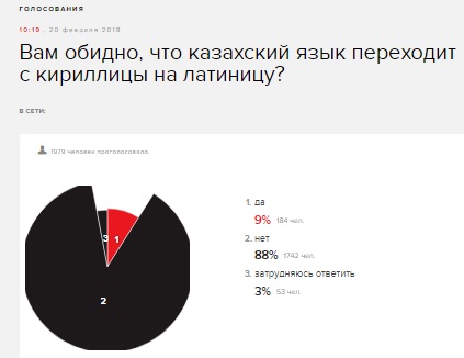 Публикация о латинице на NEWSru.com вышла под заголовком "Назарбаев, стремясь уйти от влияния России и Турции, заменил в новом казахском алфавите апострофы на акуты". А на сайте "Эха Москвы" появилось голосование с вопросом "Вам обидно, что казахский язык переходит с кириллицы на латиницу?". По данным на 15.50 по времени Астаны, 88 процентов опрошенных в Сети ответили "Нет".