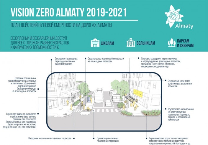 План действий Vision Zero Almaty подразумевает изменение и адаптацию дорог, улиц, знаков к особенностям поведения горожан и состоит из таких шагов, как "Безопасный город", "Безопасные улицы", "Безопасная скорость", "Безопасный общественный транспорт", "Интеллектуальная система контроля дорожного движения", "Координация всех служб" и др.