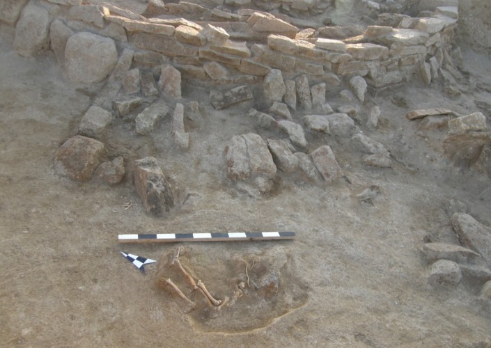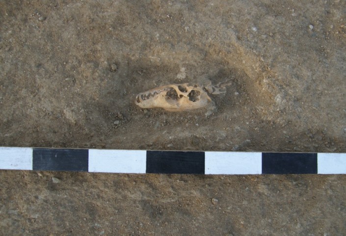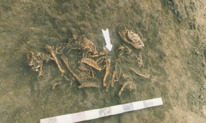 У входа в мавзолей с северной стороны лежал скелет собаки. Интересно, что череп животного лежал отдельно, в полуметре от костей туловища. По всем признакам расположения можно говорить, что собака намеренно была положена у входа в мавзолей и ее загробной функцией была охрана последнего пристанища хозяина. Хозяев, кстати, было двое - археологи нашли фаланги пальцев ног и кальцинированные кости человека. Первоначально в могиле было два человека, похороненных в разное время и в разном положении, но мавзолей впоследствии был разграблен.