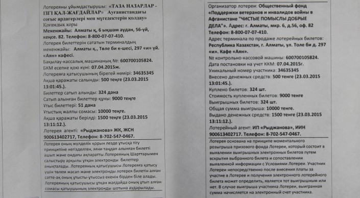 "Эти требования прописаны в постановлении правительства РК от 19 февраля 2014 года за номером 116. Мы сами недавно получили лицензию и тогда встал вопрос о проверке действующих на казахстанском рынке юридических лиц, также получивших лицензии от Министерства культуры и спорта РК. Согласно закону, на лотерейном терминале должны быть опознавательные знаки организатора лотереи, агента, который распространяет лотерейные билеты, информация о лицензии, оферте - договора с пользователем. Также этот аппарат должен выдавать чек. Мы составили списки, в котором указали, где находятся лотерейные терминалы, их адреса и перечислили все выявленные нами нарушения. Списки мы передали в региональные департаменты государственных доходов с просьбой проверить лотерейные терминалы на соответствие квалификационным требованиям и взятым на себя обязательствам перед государством. Нас интересует, зарегистрированы ли эти аппараты в департаменте госдоходов и ведут ли налоговики контроль за внесением в них наличных средств, проводится ли выдача призового фонда и платятся ли налоги. У нас в этом очень большие сомнения", - сказал Хамзин.