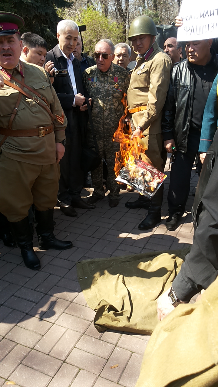 Ветераны войны в Афганистане, представители ветеранов Великой Отечественной войны, ветераны Чернобыля и  желтоксановцы публично проткнули оружием и сожгли журнал "Аныз адам. Жулдыздар отбасы" с изображением Гитлера на обложке. Такой акцией ее участники выразили свое возмущение по поводу позиции главного редактора журнала Жарылкапа Калыбая, сообщает корреспондент Tengrinews.kz.