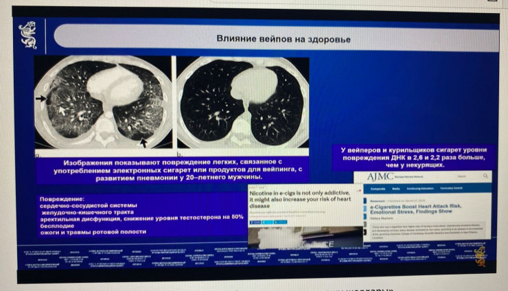 "Я сам хирург, который сделал более пяти тысяч операций на легких. С левой стороны (на фото - прим.) - это легкие курильщика. Не просто курильщика. В 2019 году на конгрессе ВОЗ показывали такое, и мы тогда думали, что в природе не бывает пневмонии, чтобы одновременно или две нижние доли, или две верхние доли заболевали. Это априори невозможно, потому что бронхиальное дерево устроено так. А вот эта симметричность... Мы тогда подумали, что это может быть начало нового коронавируса, но теперь-то становится понятным, что это никакой не коронавирус, это из-за потребления электронных сигарет", - пояснил Абай Байгенжин.
