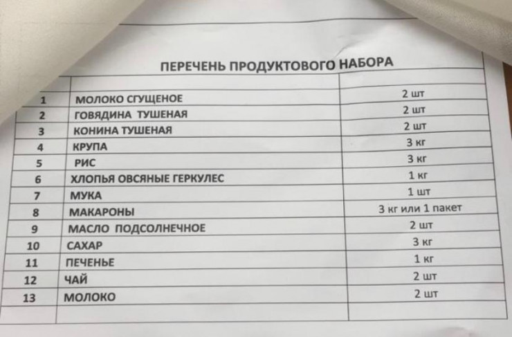 В продуктовый набор входят: растительное масло – 5 литров, макароны – 5 килограммов, соль, перловка, сахар – 5 килограммов, рис – 5 килограммов, чай – 1 килограмм, мука – 1 килограмм, печенье – 2 килограмма, маски – 50 штук.