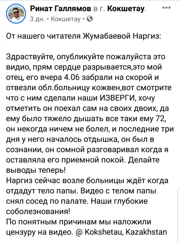 Видео с мертвым ковид-пациентом прокомментировали акмолинские медики © facebook/galluamov
