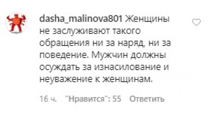 "Женщины не заслуживают такого обращения ни за наряд, ни за поведение. Мужчин должны осуждать за изнасилование и неуважение к женщинам", - отметила dasha_malinova801.