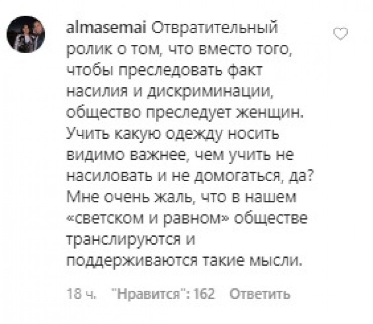 "Отвратительный ролик о том, что вместо того, чтобы преследовать факт насилия и дискриминации, общество преследует женщин. Учить, какую одежду носить, видимо, важнее, чем учить не насиловать и не домогаться, да? Мне очень жаль, что в нашем "светском и равном" обществе транслируются и поддерживаются такие мысли", - написала пользовательница almasemai.