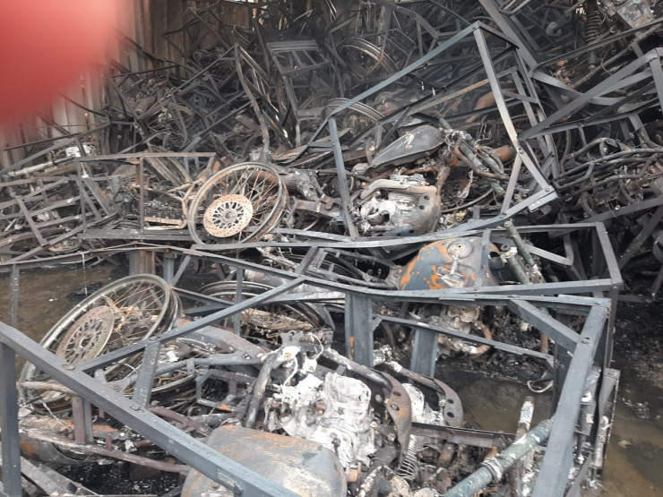 Пожар был потушен в 17.11 часов 29 мая. На видео запечатлены его последствия - обгоревшие остовы мотоциклов и другой мототехники, покореженные запчасти и металлоконструкции, почерневшие от огня стены.