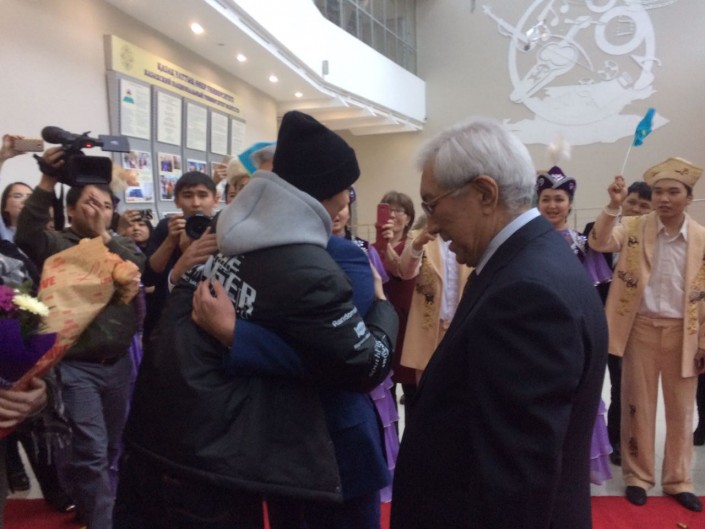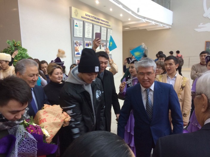 Встреча Димаша в альма-матер молодого певца переросла в концертную программу, которую организовали студенты и преподаватели КазНУИ. На красной дорожке Димаша ждал министр культуры и спорта Казахстана Арыстанбек Мухамедиулы вместе с преподавателями.