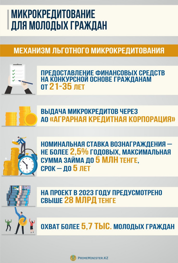 С 1 января 2023 года во исполнение поручения Главы государства в рамках Нацпроекта по развитию предпринимательства на 2021-2025 годы внедрен новый механизм льготного микрокредитования для молодых казахстанцев. Финансовые средства будут предоставляться на конкурсной основе гражданам от 21 года до 35 лет, желающим начать собственное дело либо уже занимающимся предпринимательством, в том числе производством или реализацией товаров, выполнением работ и оказанием услуг, производством продукции в личном подсобном хозяйстве и др.