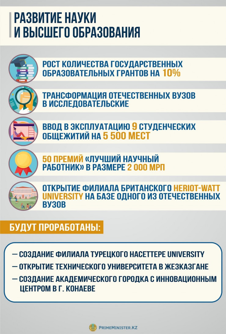 Особое внимание будет также уделено развитию науки и высшего образования в новых регионах республики. Так, в рамках исполнения поручения Главы государства будут проработаны вопросы открытия технического университета в Жезказгане и создания академического городка с инновационным центром в Конаеве.