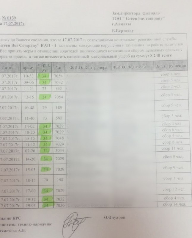 По его информации, водители, которые бастуют, не пробивают билеты пассажирам, которые платят наличными. Более 80 процентов нарушений невыдачи билетов приходится на 34 маршрут. Баурджан Кулишев поделился отчетами контролеров Green Bus Company о нарушениях водителями автобусов.
