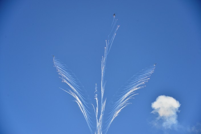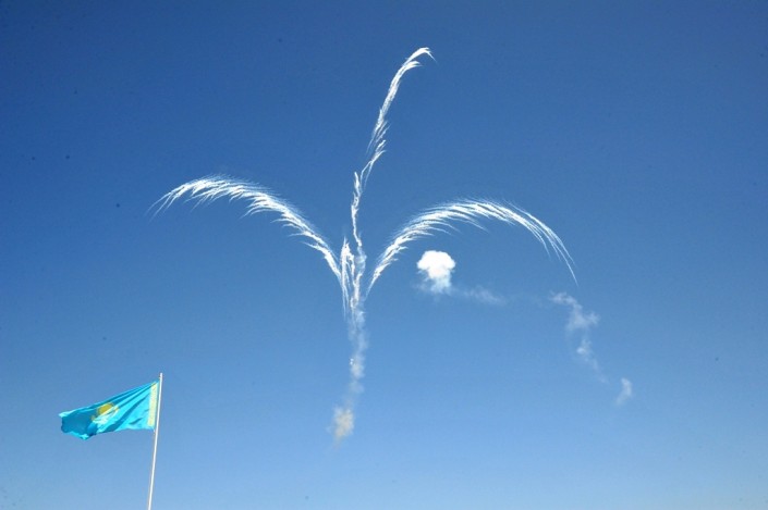 Одиночный пилотаж на новом самолете Су-30 продемонстрировали подполковники Владимир Ткач и Темиртас Ибраев. Они выполнили фигуры высшего пилотажа: "петлю Нестерова", "форсированный разворот на горке", "управляемый штопор", "колокол" и "форсированный вираж на малых скоростях". Летное мастерство продемонстрировала пилотажная группа "Жетысу" в составе трех самолетов Су-27 и одного истребителя Су-30. Ведущим группы выступил полковник Тимур Омаров, за ним на боевых самолетах следовали подполковники Нурлан Оразов и Арслан Галимов, а также полковник Ерлан Козгулов, замыкавший пилотажную группу.